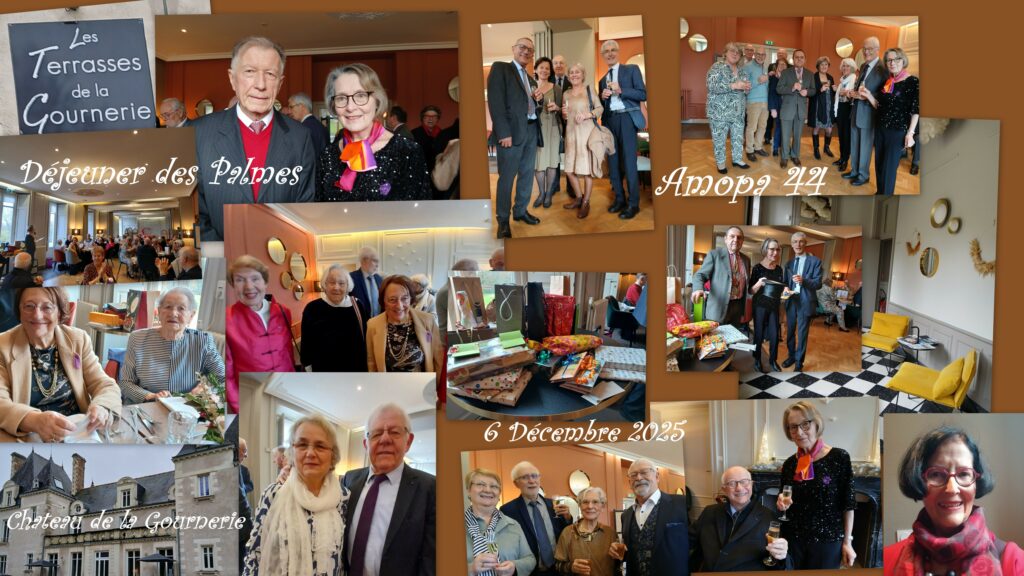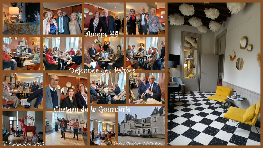 Samedi 6 décembre 2025, une cinquantaine d’adhérents de l’AMOPA 44 se sont retrouvés comme tous les ans pour le « Déjeuner des Palmes » . Le Château de la Gournerie fut cette année encore le théâtre de ce moment de convivialité très prisé. Dans un cadre élégant et bucolique, ce déjeuner de fin d’année, animé par les membres du bureau autour de la traditionnelle tombola, constitua un moment où les conversations, toujours de bonne facture, ont permis à toutes et tous de bénéficier une fois encore de ce précieux moment de ressourcement.